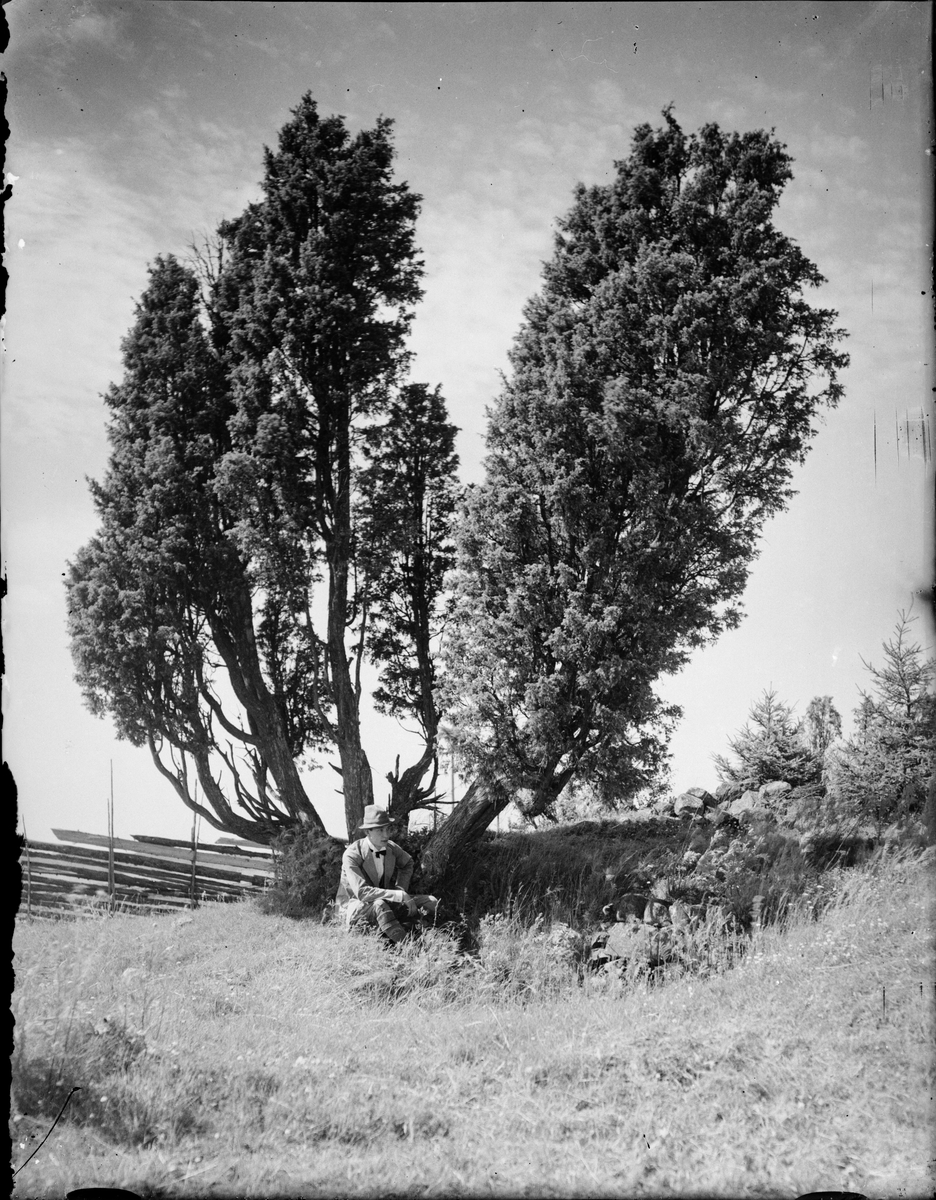 Josef Edhlund sittande vid enbuske, Östhammar, Uppland