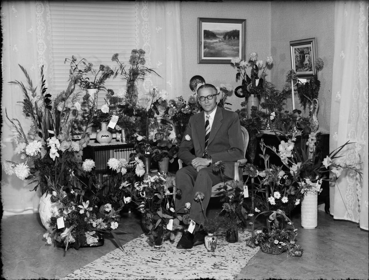 Man omgiven av blommor i bostadsmiljö, Östhammar, Uppland