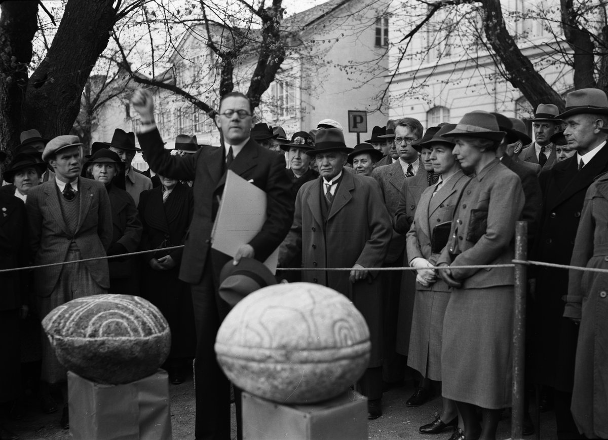 Landsantikvarie Nils Sundquist visar gravklot från Uppsala, Bälinge och Rasbokil på Upplands fornminnesförenings Uppsaladag, åplanteringen vid korsningen Östra Ågatan - Klostergatan