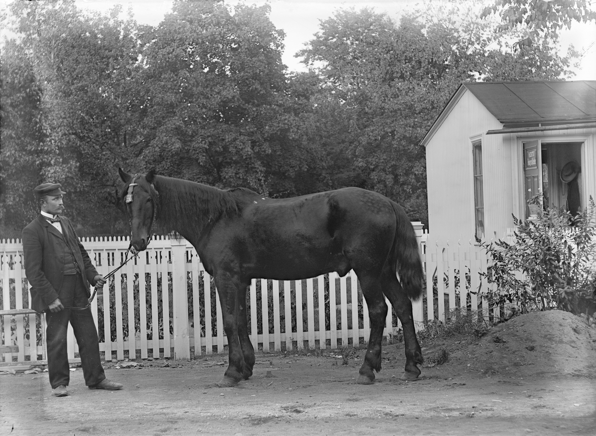 Man med häst utanför Ostis ateljé, Bredgränd 11, Uppsala före 1914