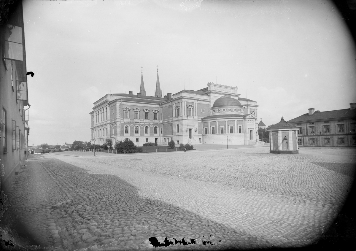 Universitetshuset i Uppsala i juli 1890, baksidan, mot Övre Slottsgatan. I förgrunden S:t Olofsgatan.