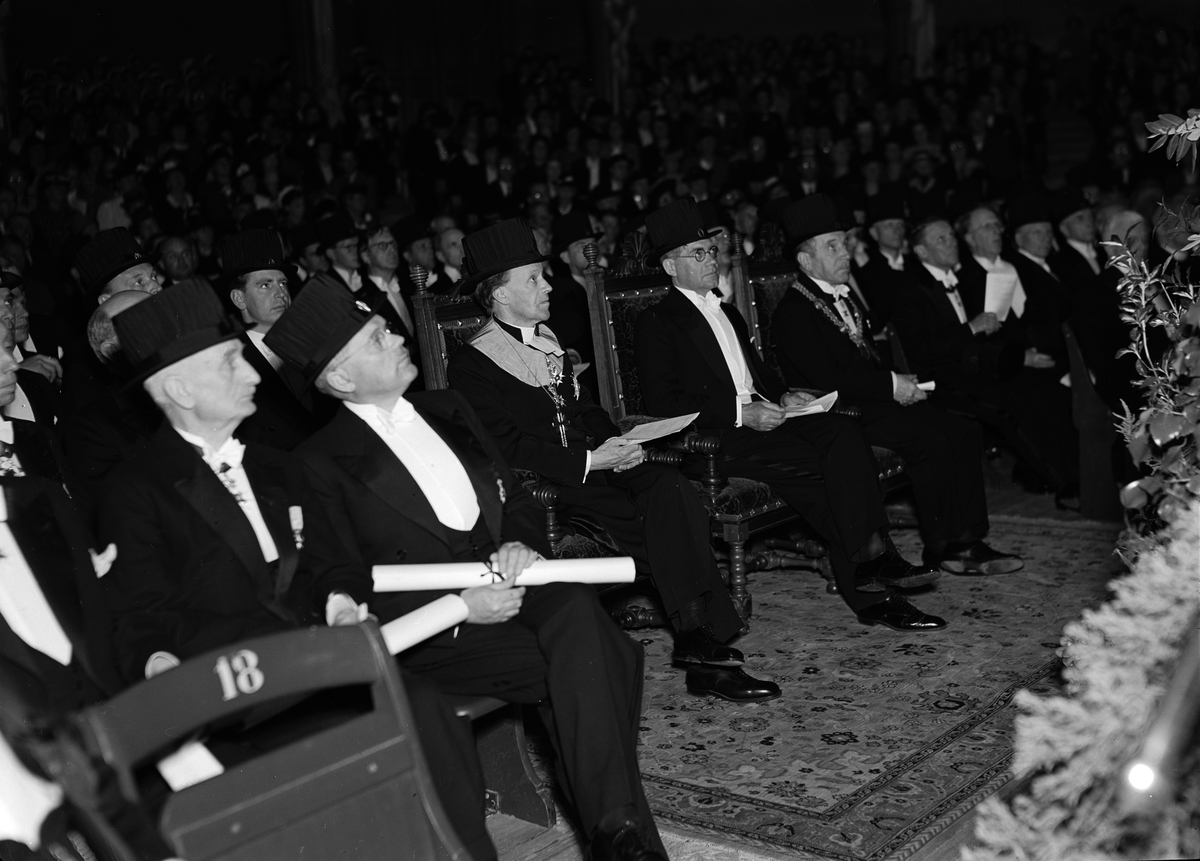 "Prokanslern, kanslern och rector magnificus, omgivna av promovendi", doktorspromotion i Universitetsaulan