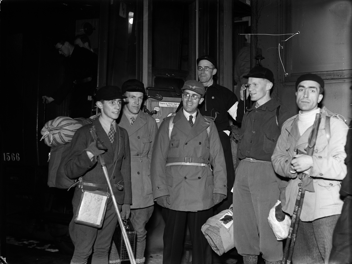 En grupp manliga studenter tillsammans med färdledaren gymnastikdirektör Gösta Sandin vid avfärden från Uppsala centralstation