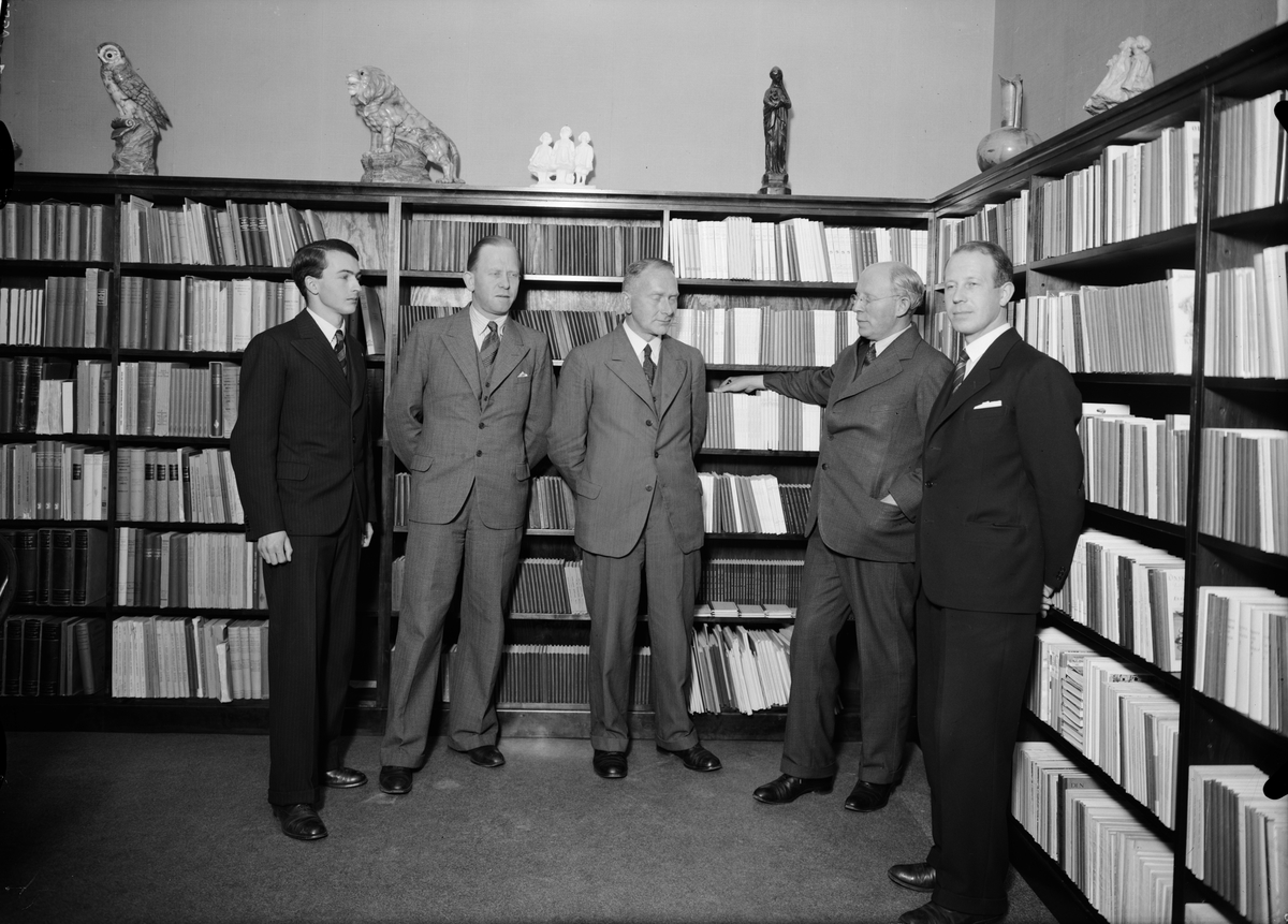 Grupporträtt - personal hos hundrarårsjubilerande AB Lundequistska Bokhandeln, Drottninggatan - Östra Ågatan. Tvåa från höger verkställande direktören Nils Wallin