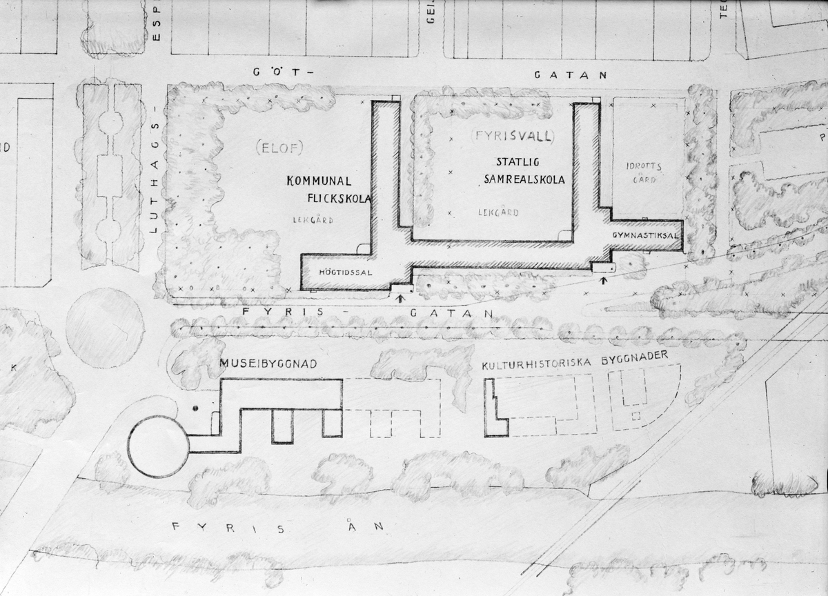 Ritning - förslag på placering av museum, sannolikt Upplandsmuseet, vid Fyrisgatan - Luthagsesplanaden, Uppsala 1938