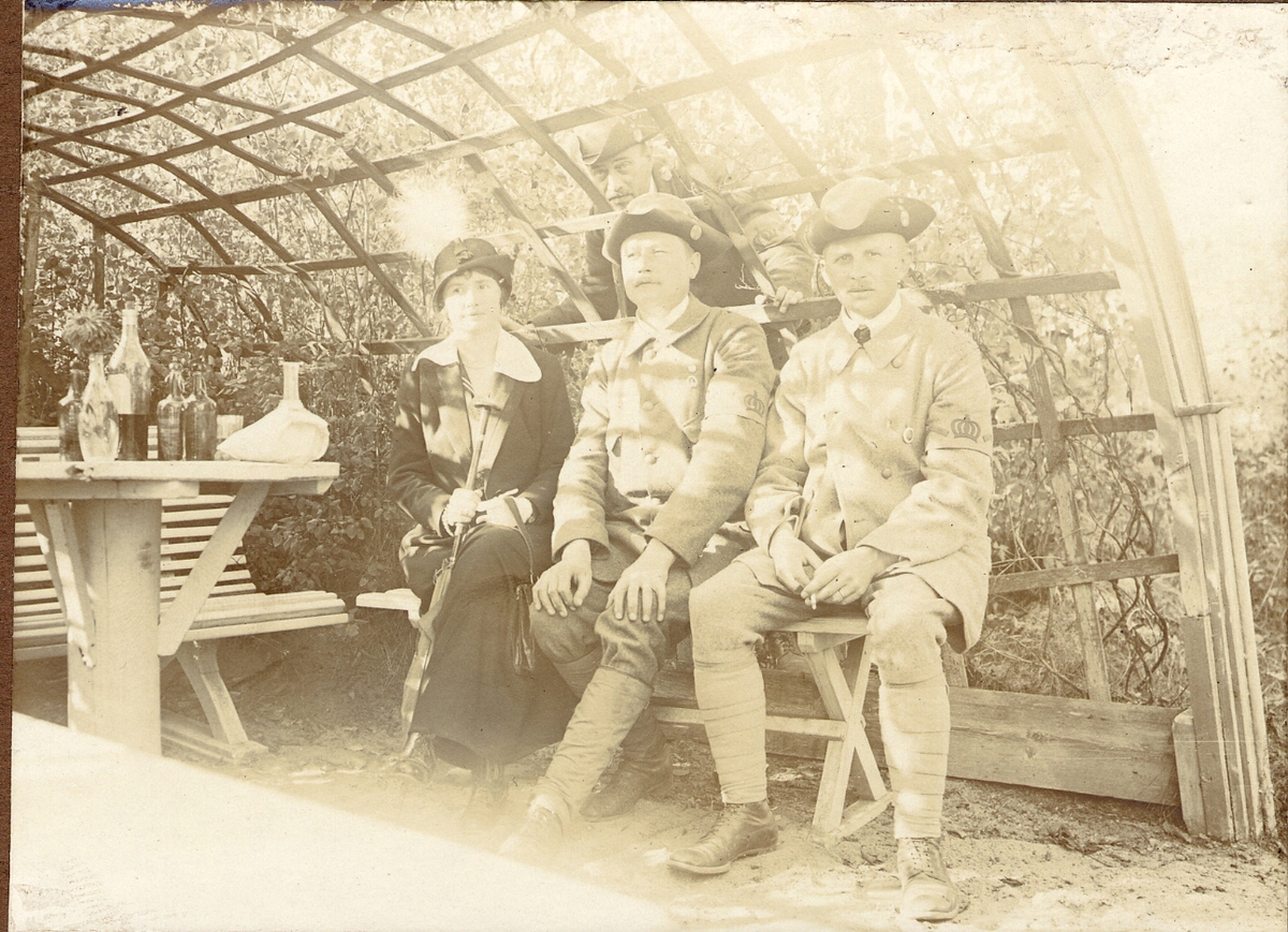 Tre män i Landstormsuniform och en kvinna sitter på en bänk i en trädgård i Löttinge, Täby, 1914. På bordet står flera flaskor.