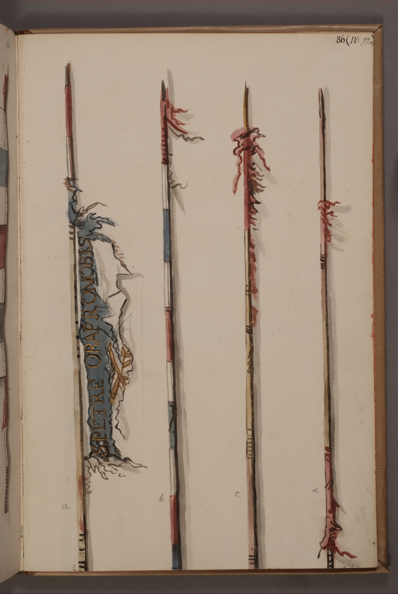 Avbildning i gouache föreställande fälttecken tagna som trofé av svenska armén. De två avbildade fanorna längst till vänster i bild finns bevarade i Armémuseums samling, för mer information, se relaterade objekt.