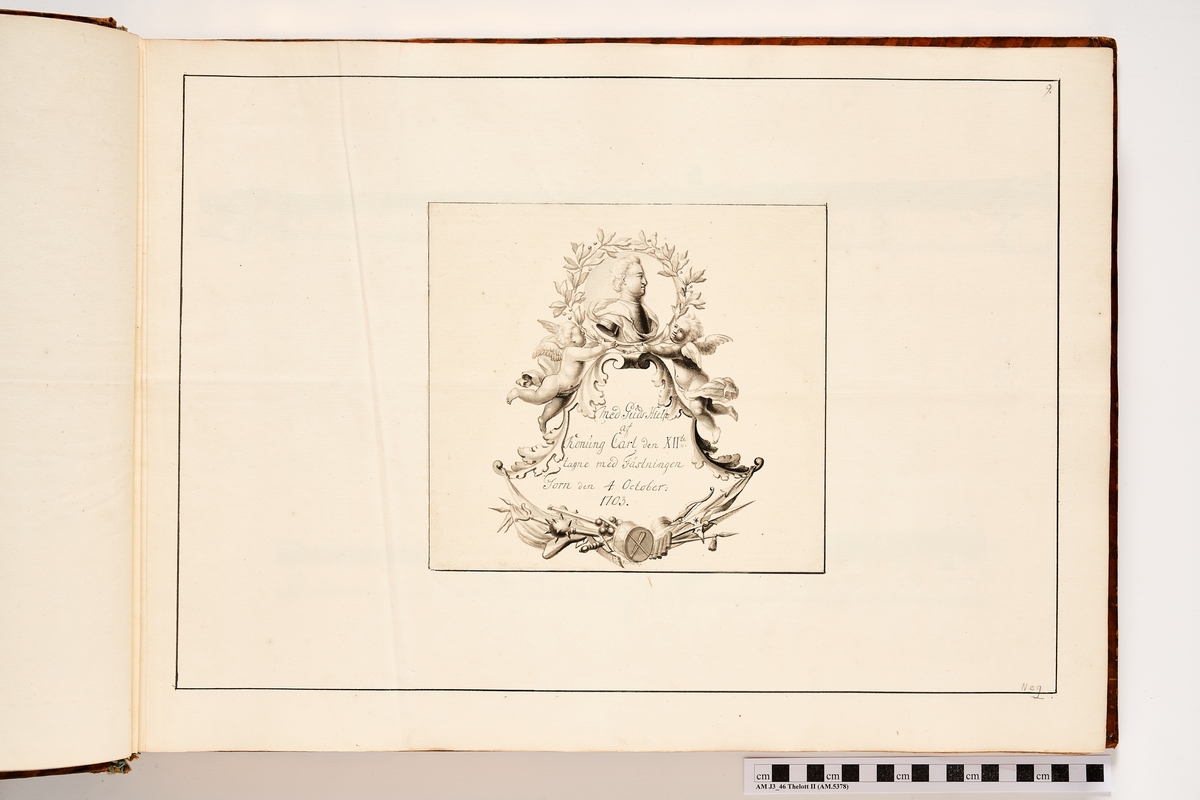 Kartusch till bokverk med avbildningar föreställande eldrör tagna som troféer av den svenska armén åren 1703-1706, utförda av syskonen Anna Maria och Philip Jakob Thelott. Avser troféer tagna med fästningen Torn den 4 oktober 1703.