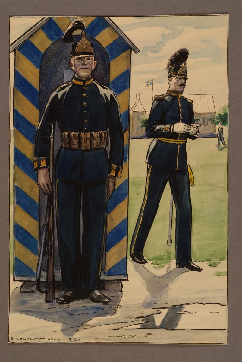 Plansch med uniform för soldat och officer vid Västgöta regemente 1900, ritad av Einar von Strokirch.