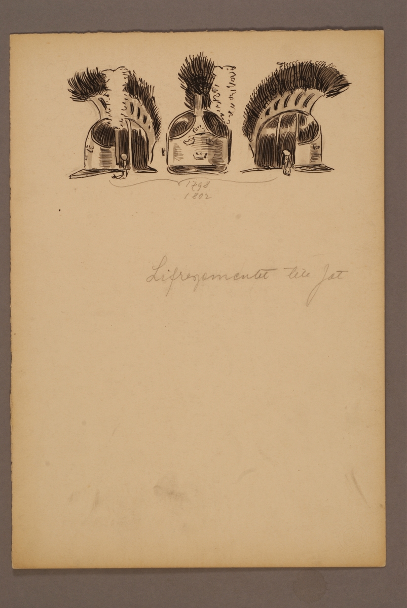 Plansch med huvudbonader för Livregementet till fot för åren 1798-1802, ritad av Einar von Strokirch.