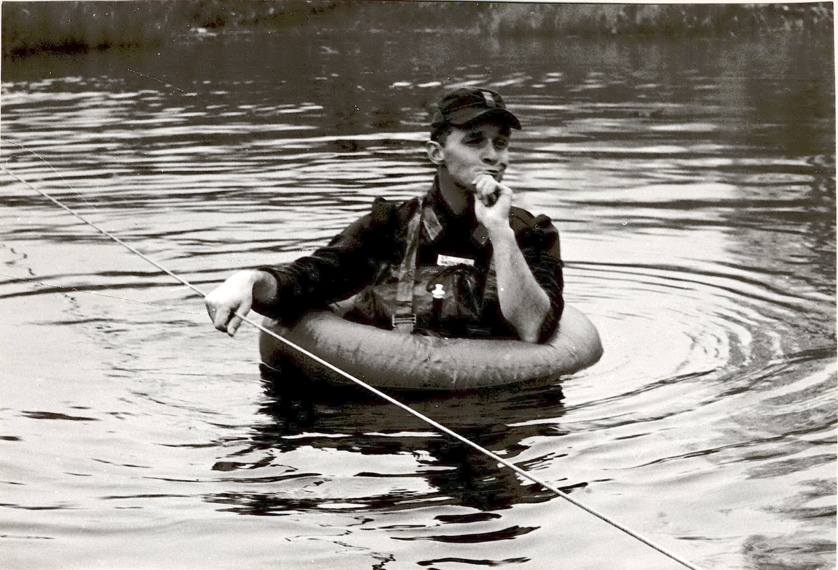 Titel: Elev från infanterikadettskolan i Ulriksdal korsar vattenled.