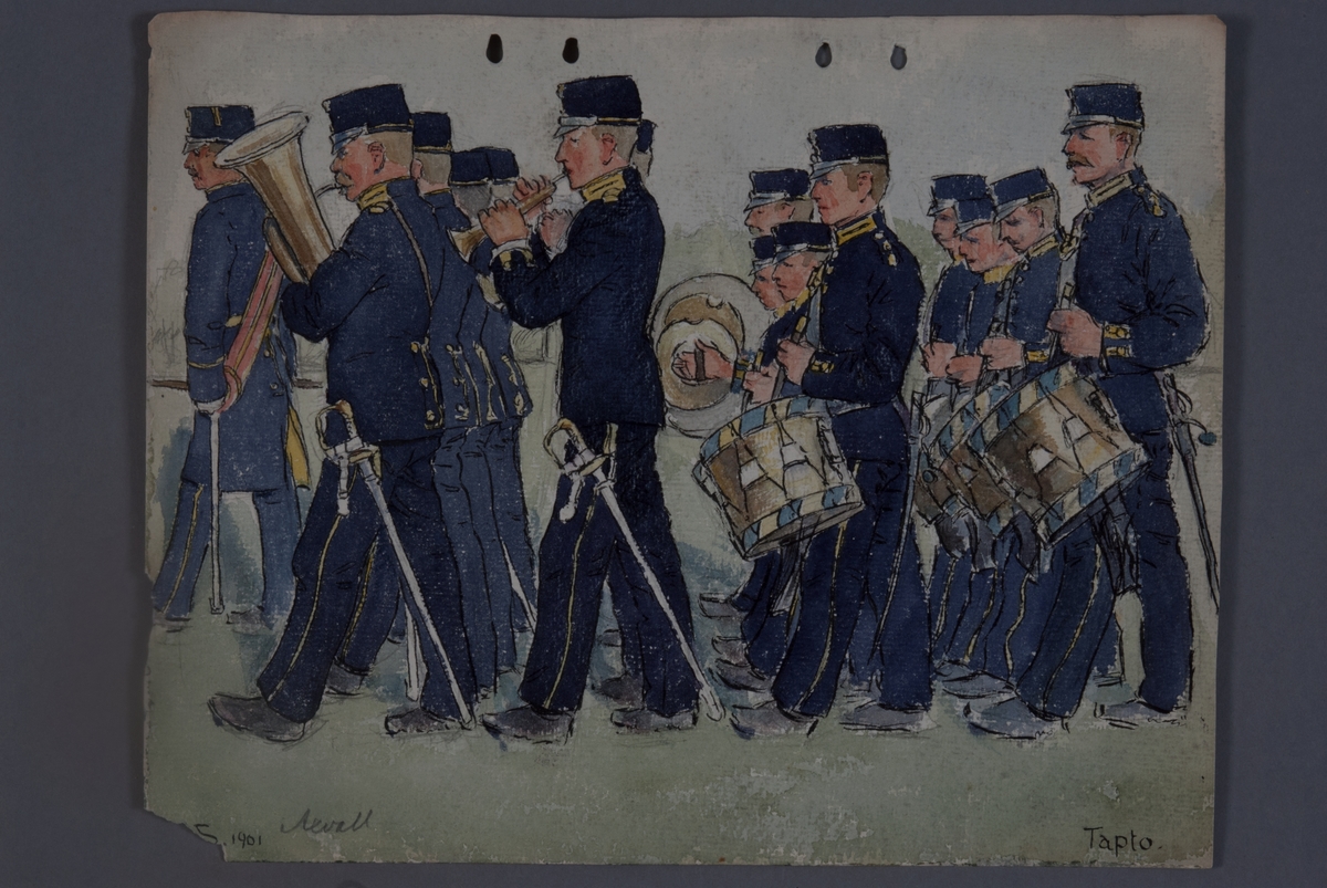 Musikkår spelar tapto, teckning av Einar von Strokrich.