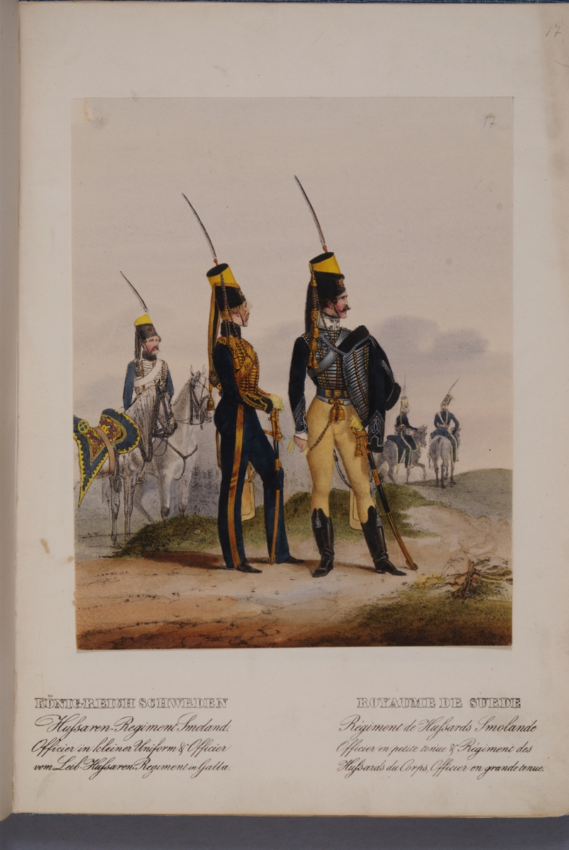 Plansch med uniform för officer vid Smålands husarregemente och officer vid Livregementets husarer. Ingår i planschsamlingen Das europäische Heer in charakteristischen Gruppen: Scweden, utgiven av Eckert und Monten ca 1840.