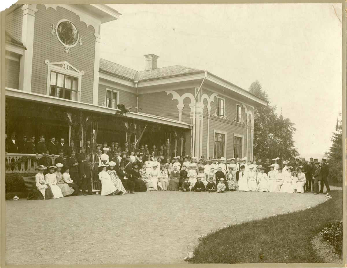 Officerare med damer och barn samlade utanför officersmässen vid Trossnäs övningsfält tillhörande Värmlands regemente.