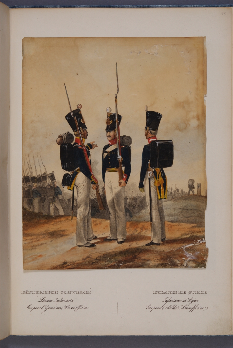 Plansch med uniform för korpral, manskap och underofficer vid linjeinfanteriet. Ingår i planschsamlingen Das europäische Heer in charakteristischen Gruppen: Scweden, utgiven av Eckert und Monten ca 1840.