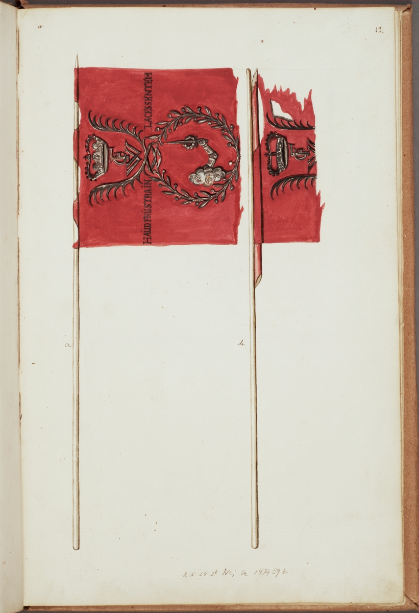 Avbildning i gouache föreställande fälttecken taget som trofé av svenska armén. De avbildade standaren finns inte bevarade i Armémuseums samling.