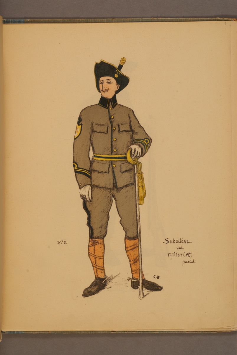 Subaltern vid rytteriet iförd paraduniform m/1906. Illustration av Carl Hellström i skriften Huvudsakliga innehållet af Generalorder den 26 okt. 1906 n:r 1170-1176.