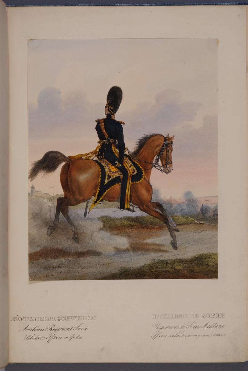Plansch med paraduniform för subalternofficer vid Svea artilleriregemente. Ingår i planschsamlingen Das europäische Heer in charakteristischen Gruppen: Scweden, utgiven av Eckert und Monten ca 1840.