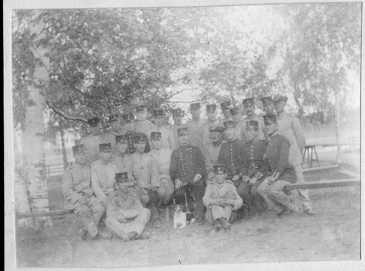 Titel: Grupporträtt på soldater ur Hälsinge regemente I 14. Längst fram i mitten ligger en hund.