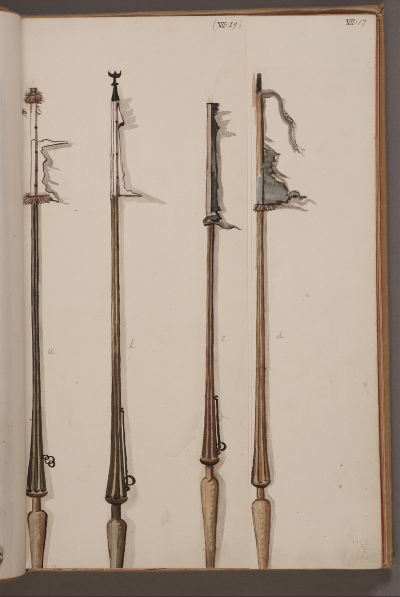 Avbildning i gouache föreställande standarstänger tagna som troféer av svenska armén. Stången längst till vänster och näst längst till höger i bild finns bevarade i Armémuseums samling, för mer information, se relaterade objekt.
