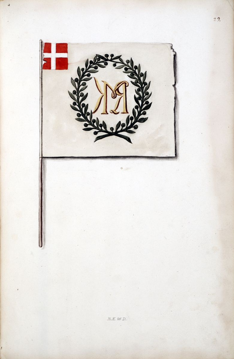 Avbildning i gouache föreställande kvartersfana tagen som trofé av svenska armén. Den avbildade kvartersfanan finns bevarad i Armémuseums samling, för mer information, se relaterade objekt.