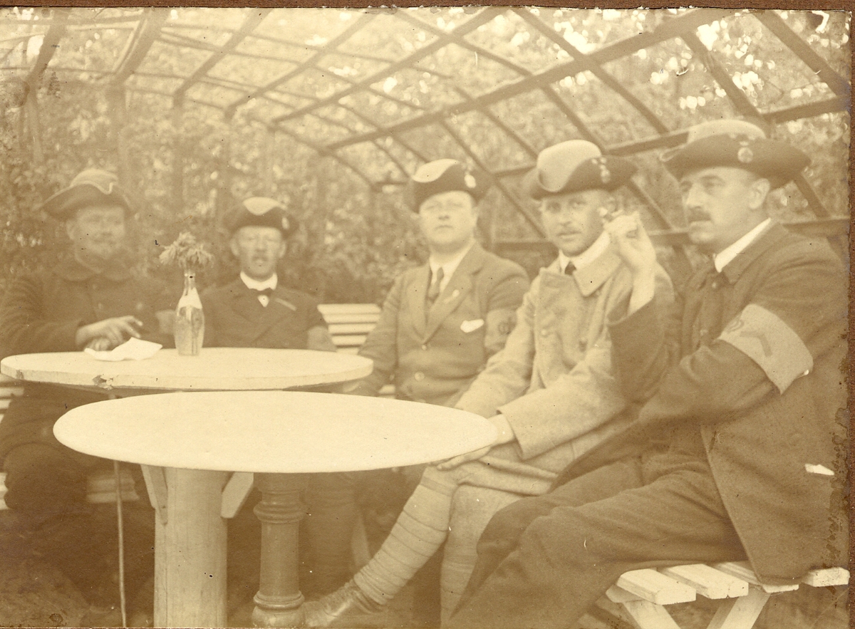 Män i Landstormsuniform sitter framför bord i trädgård i Löttinge, Täby, 1914.