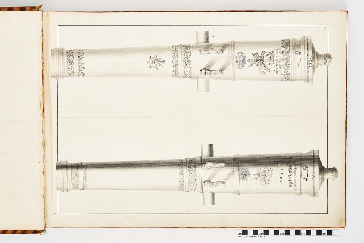 Avbildning föreställande eldrör tagna som troféer av den svenska armén i slaget vid Narva den 20 november 1700. Ingår i volym med avbildade kanontroféer tagna åren 1700-1702.