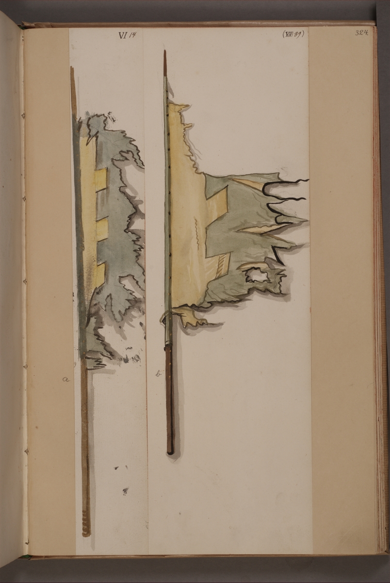 Avbildning i gouache föreställande fanor tagna som troféer av svenska armén. Fanan längst till höger i bild finns bevarad i Armémuseums samling, för mer information, se relaterade objekt.