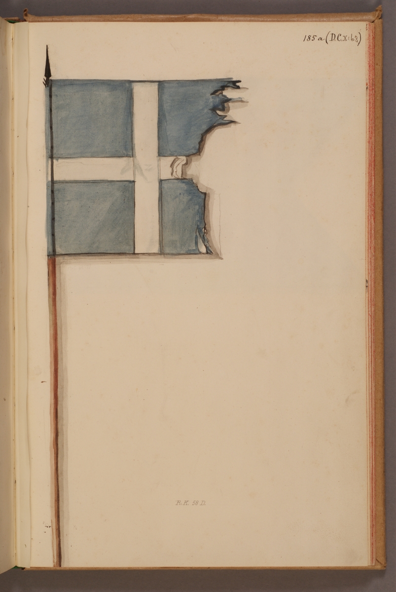 Avbildning i gouache föreställande fälttecken taget som trofé av svenska armén. Den avbildade fanan finns inte bevarad i Armémuseums samling.