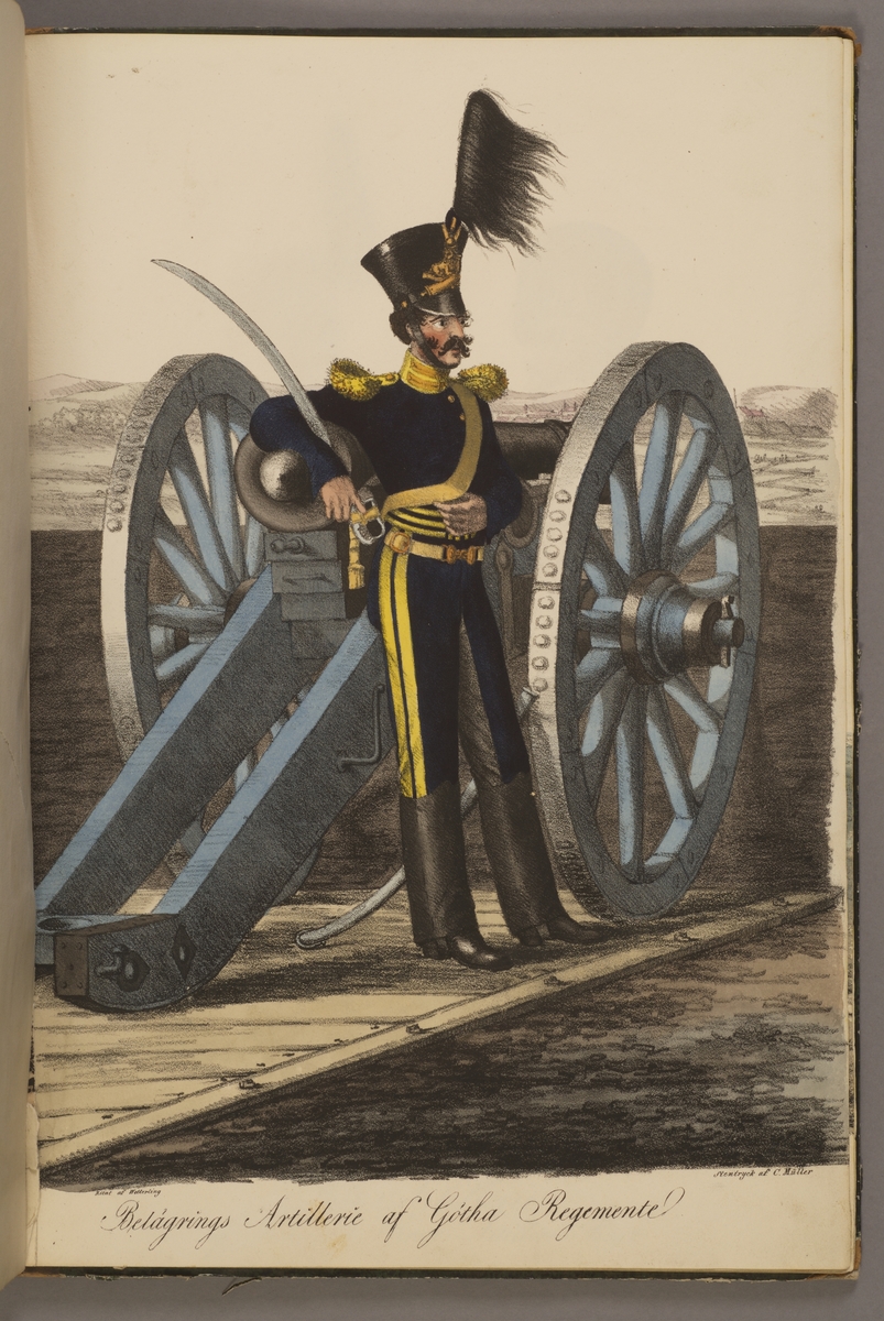 Plansch med uniform för Göta artilleriregemente. Handkolorerad litografi efter original av Alexander Clemens Wetterling. Ingår i planschsamlingen Kongliga svenska arméens uniformer utgiven som stentryck av Müller 1825.