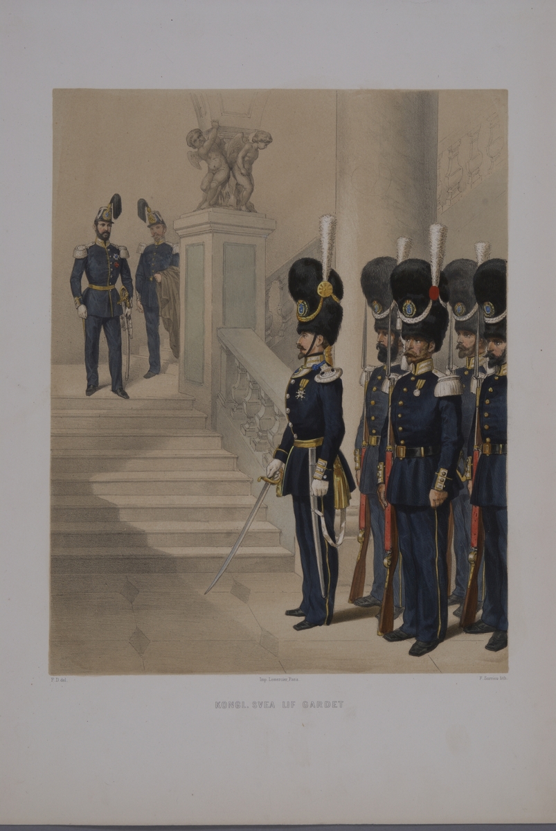 Plansch med uniform för Svea livgard. Plansch i färgtryck efter original av Fritz von Dardel. Ingår i planschsamlingen Den svenska och norske armeens uniformer, 1861-1863.