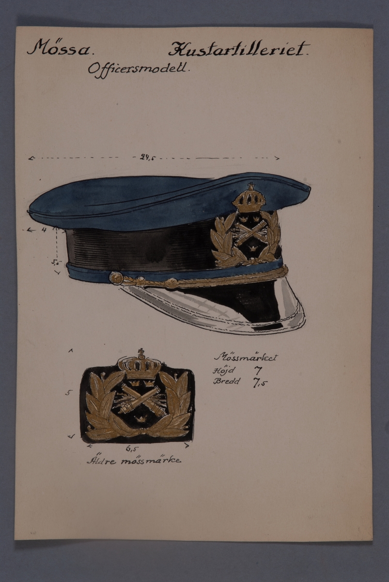 Uniformsteckning i original av Einar von Strokirch, mössa för officer vid Kustartilleriet.