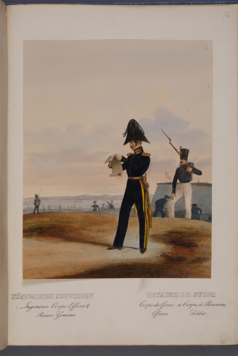 Plansch med uniform för officer vid Ingenjörkåren. Ingår i planschsamlingen Das europäische Heer in charakteristischen Gruppen: Scweden, utgiven av Eckert und Monten ca 1840.