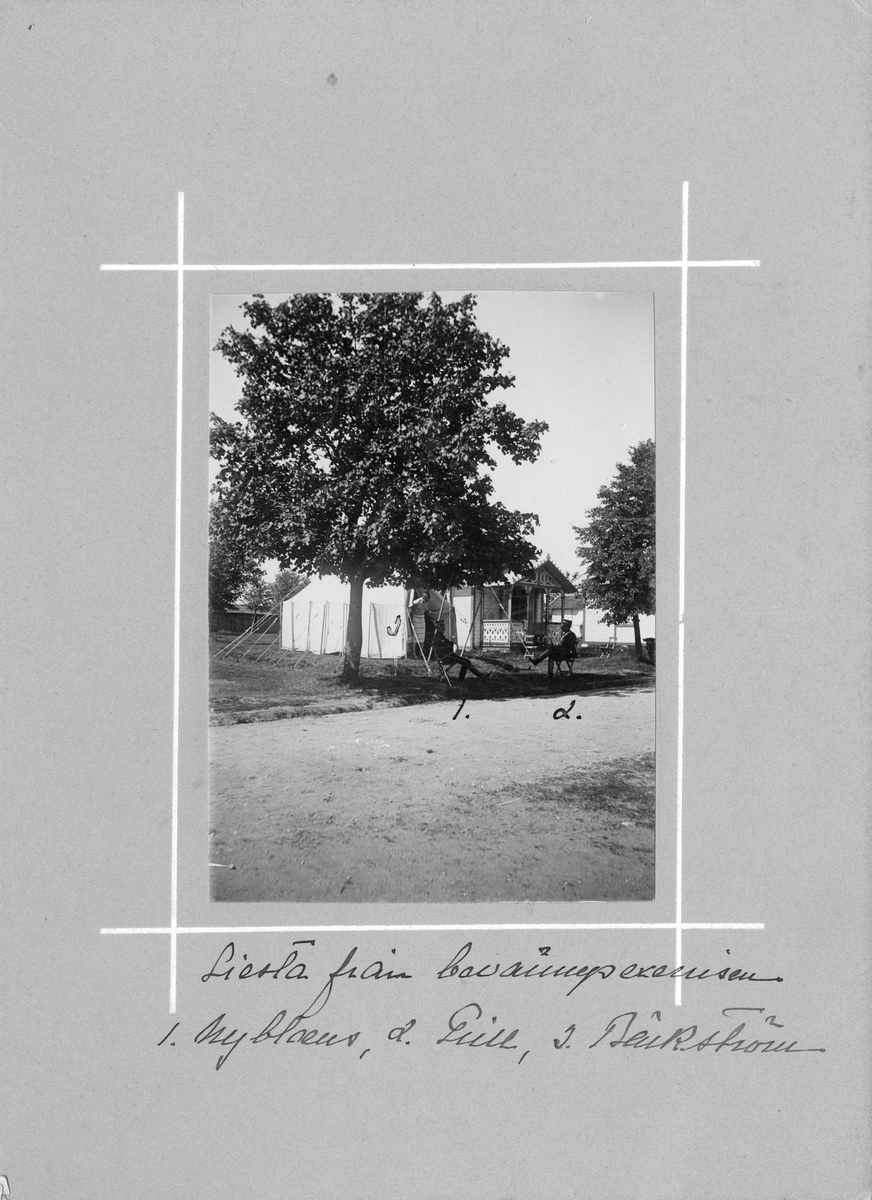 Tre officerare från Livregementets husarer K 3 rastar vid tält under beväringsexercisen, från vänster Bäckström, Nyblaeus, Grill.