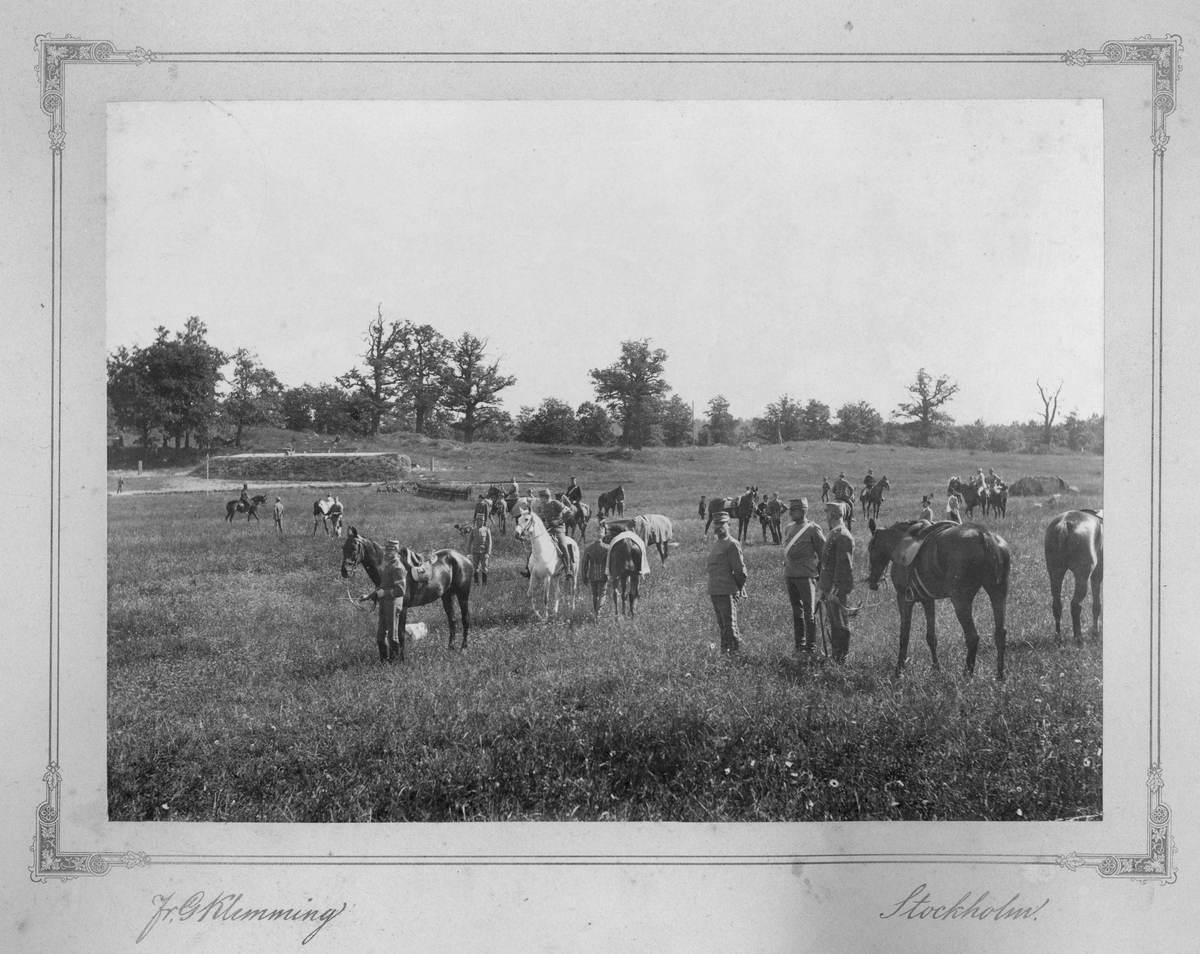 Soldater från Livgardet till häst, K 1, har suttit av vid ridbana.