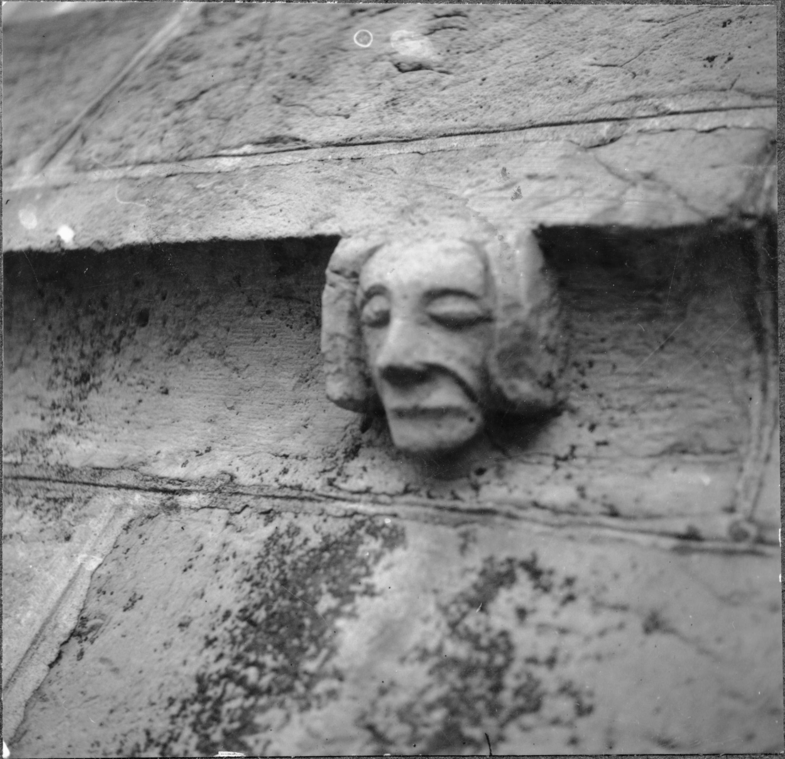 Skulpterat huvud, nummer fyra av fyra, under stora övre fönstret på västfasaden. Fotograferat när fönsterrutorna byttes efter branden 1936.