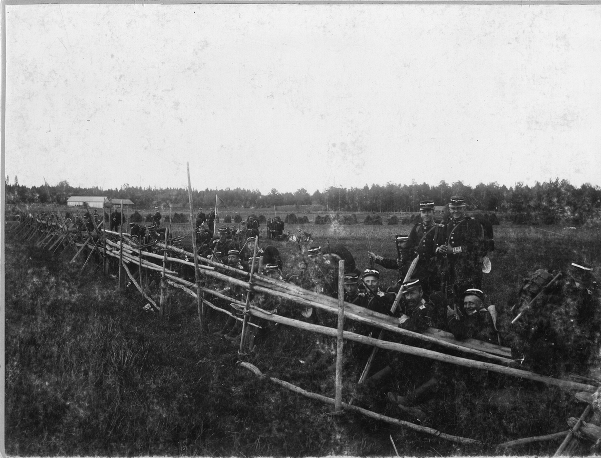 Soldater ur Livregementet till fot I 3, hukar bakom gärdesgård under manövern i Närke 1895. Soldaterna iförda uniform m/1886 och med vita band i käppin.