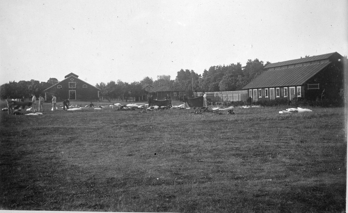 Soldater packar tält, vid lada på Ultuna?, Uppsala 1895.