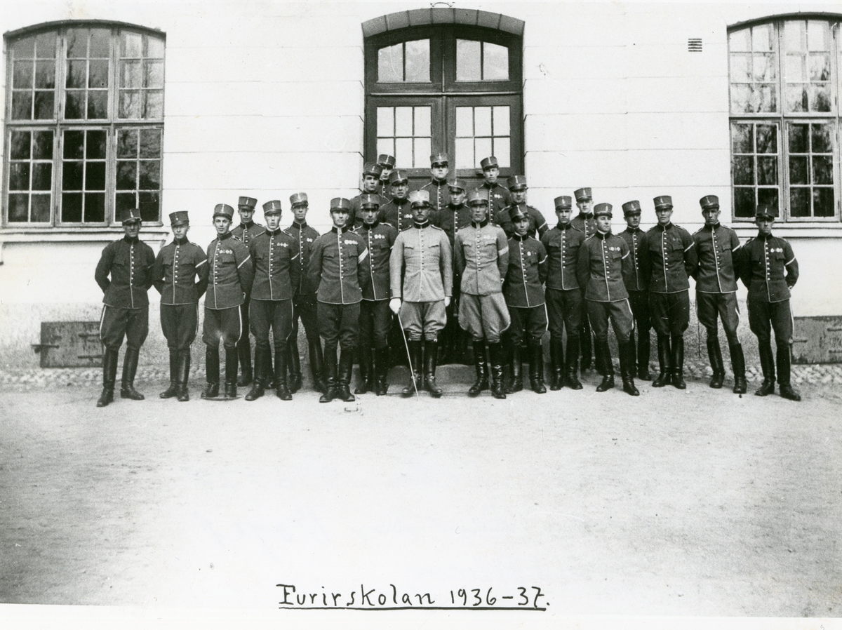 Titel: Grupporträtt av soldater från Norrlands dragonregemente K 4 vid Furirskolan 1936-1937.