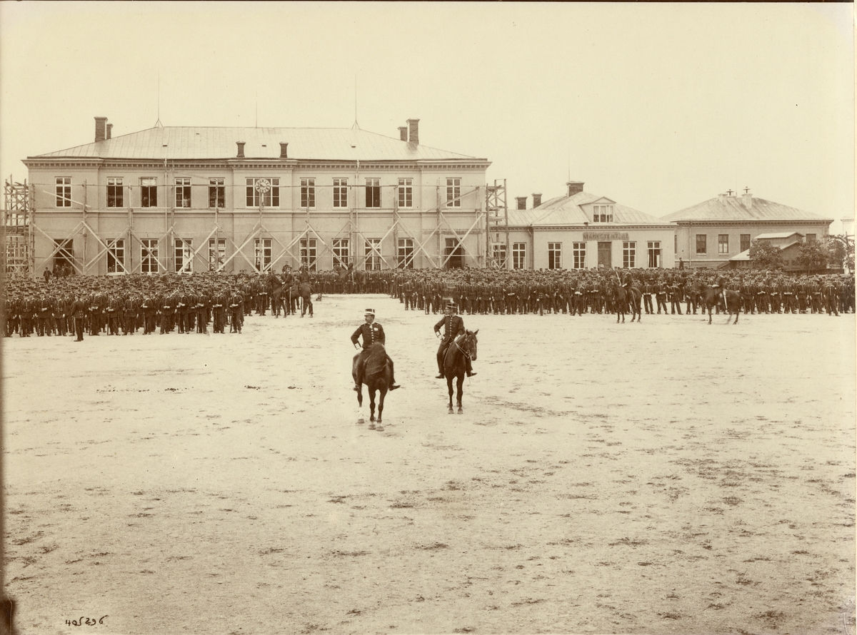 Göta livgarde I 2 uppställt på kaserngården 1906. Framför trupperna överste Johan Ludvig August Falkman till häst.