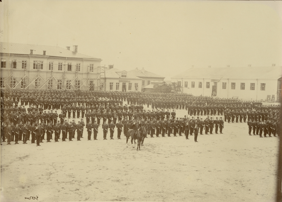 Titel: Göta livgarde I 2 uppställt på kaserngården 1906.