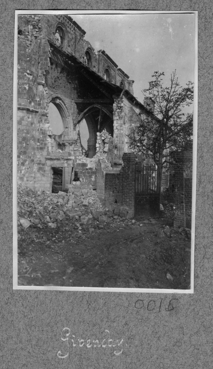 Titel: Kyrka med bombskador.