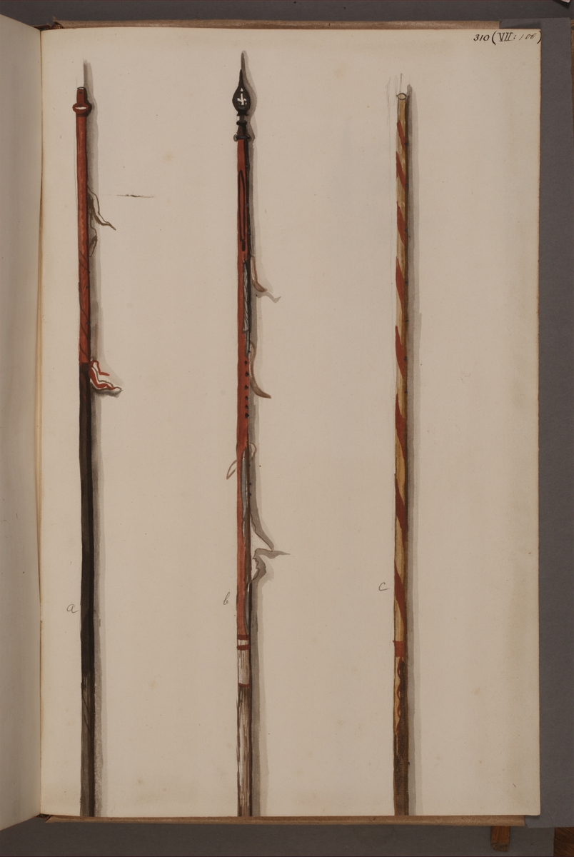 Avbildning i gouache föreställande fanstänger tagna som troféer av svenska armén. Stången längst till vänster i bild finns bevarad i Armémuseums samling, för mer information, se relaterade objekt.