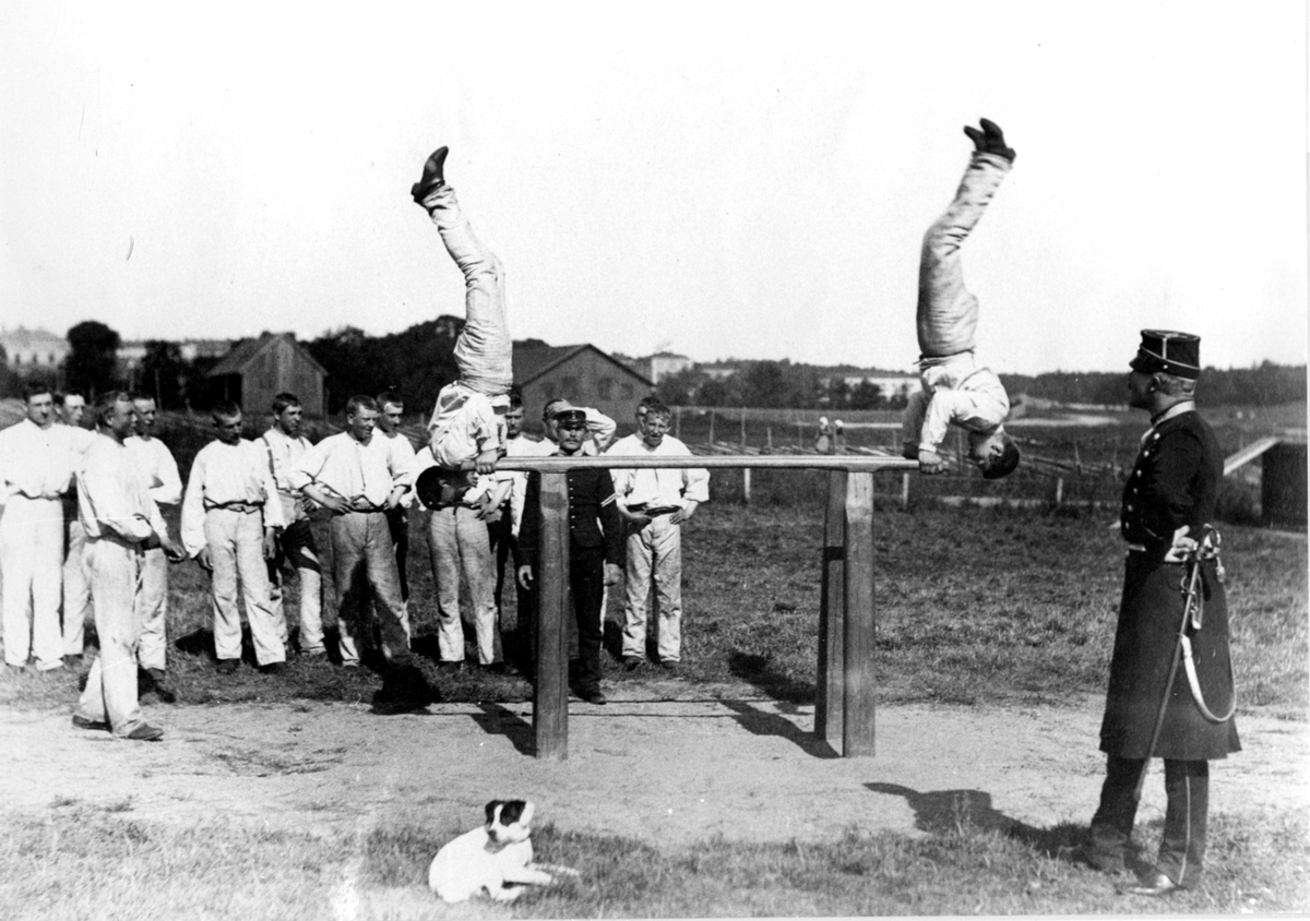 Titel: Svea livgarde ägnar sig åt fysisk träning på barr 1890.