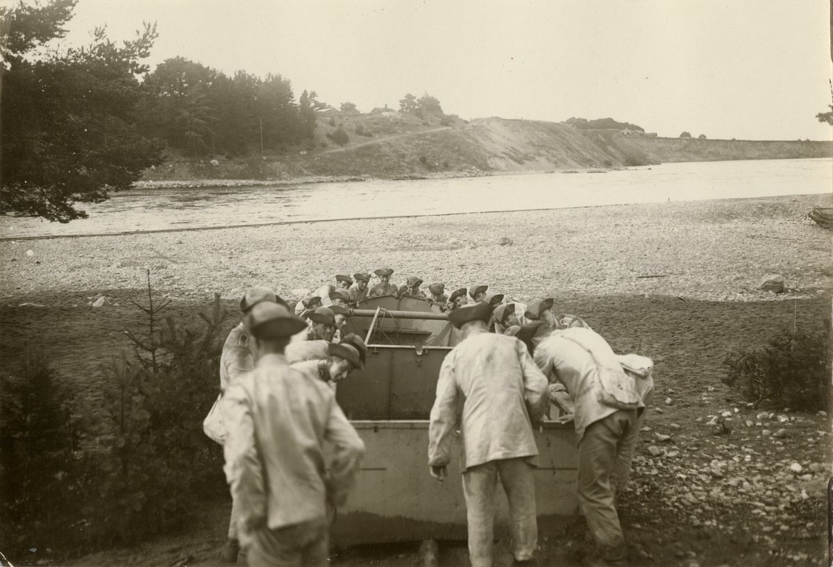 Titel: Elever från Krigsskolan Karlberg bygger pontonbro över vattendrag.