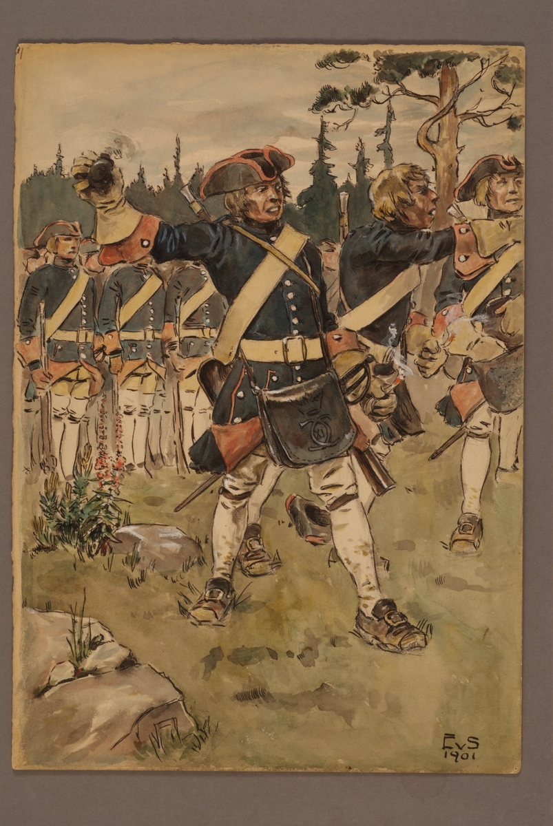 Plansch med uniform för Indelta linjeinfanteriet 1765, ritad av Einar von Strokirch.
