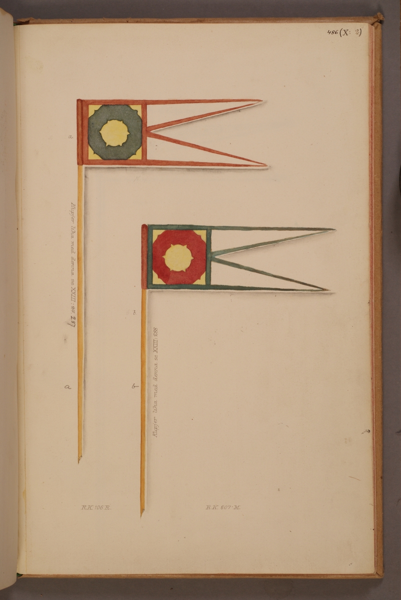 Avbildning i gouache föreställande fälttecken tagna som troféer av svenska armén. De avbildade lansfanorna finns bevarade i Armémuseums samling, för mer information, se relaterade objekt.