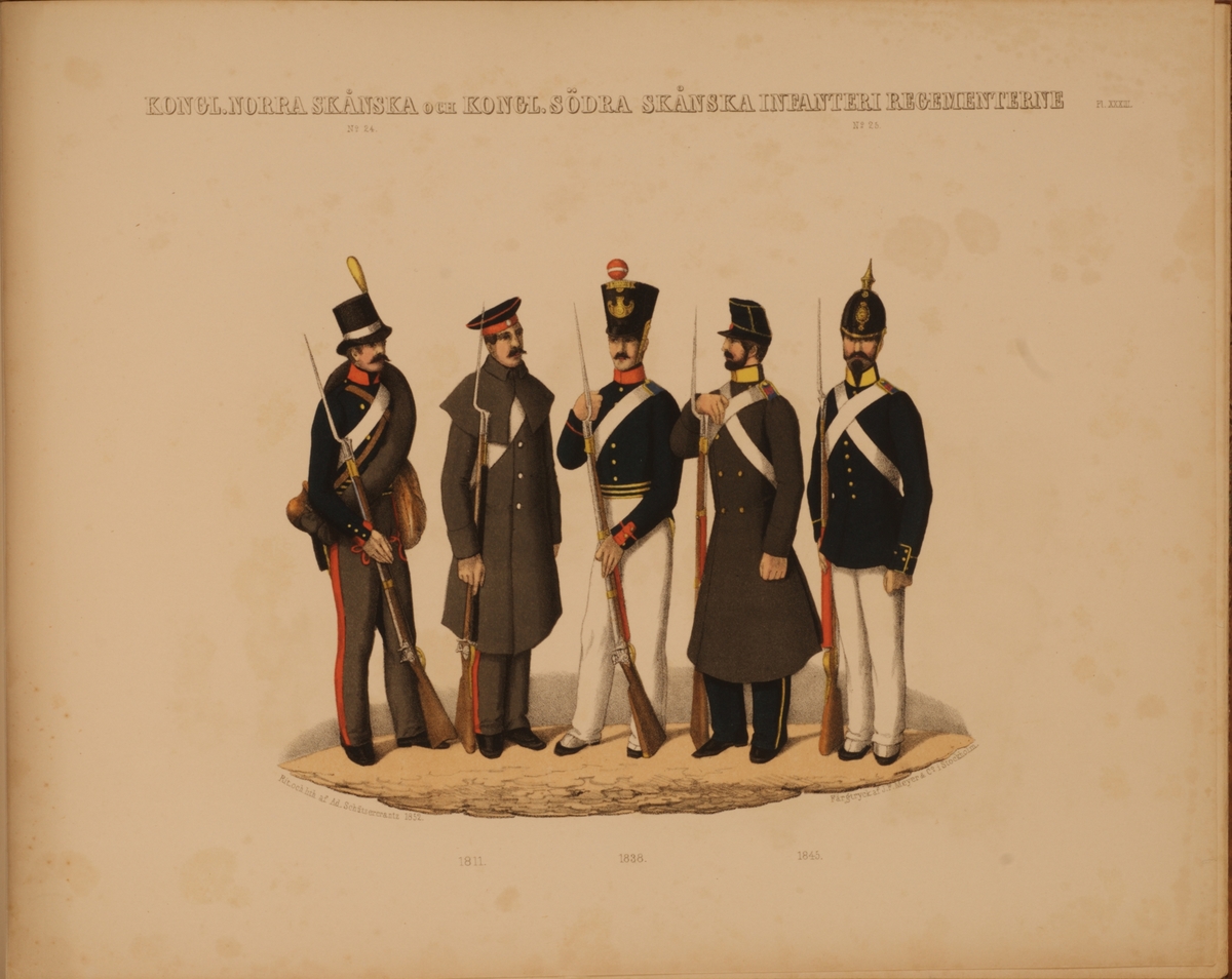 Plansch med uniform för Norra skånska infanteriregementet och Södra skånska infanteriregementet för åren 1811-1845. Plansch i färgtryck efter original av Adolf Ulrik Schützercrantz. Ingår i planschsamlingen Svenska krigsmaktens fordna och närvarande munderingar.