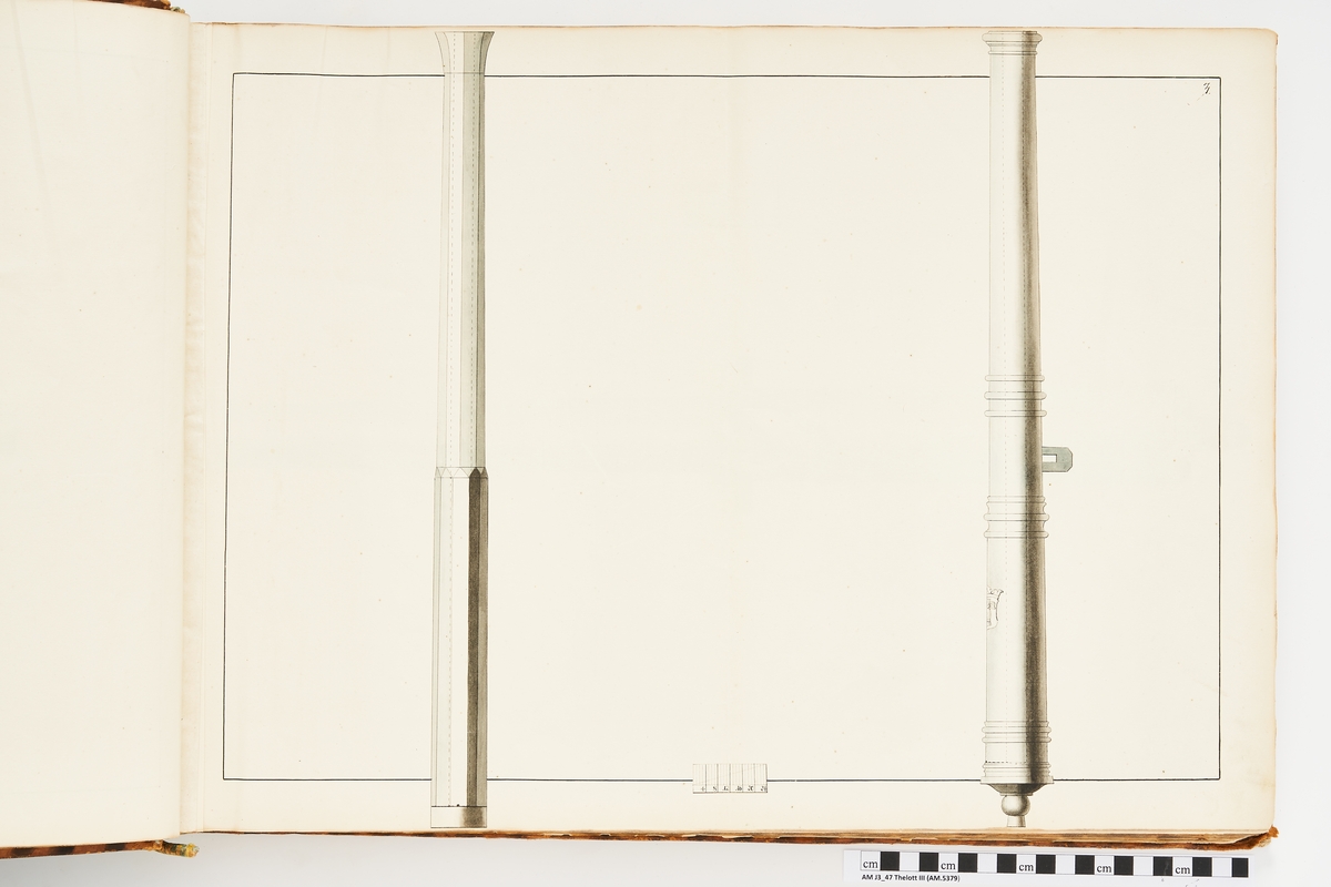 Avbildning föreställande gamla svenska metallstycken som legat på rikets fästningar, med Vasaättens vapen. Ingår i volym med avbildade äldre svenska eldrör förvarade på fästningar samt eldrör erövrade åren 1598-1679.