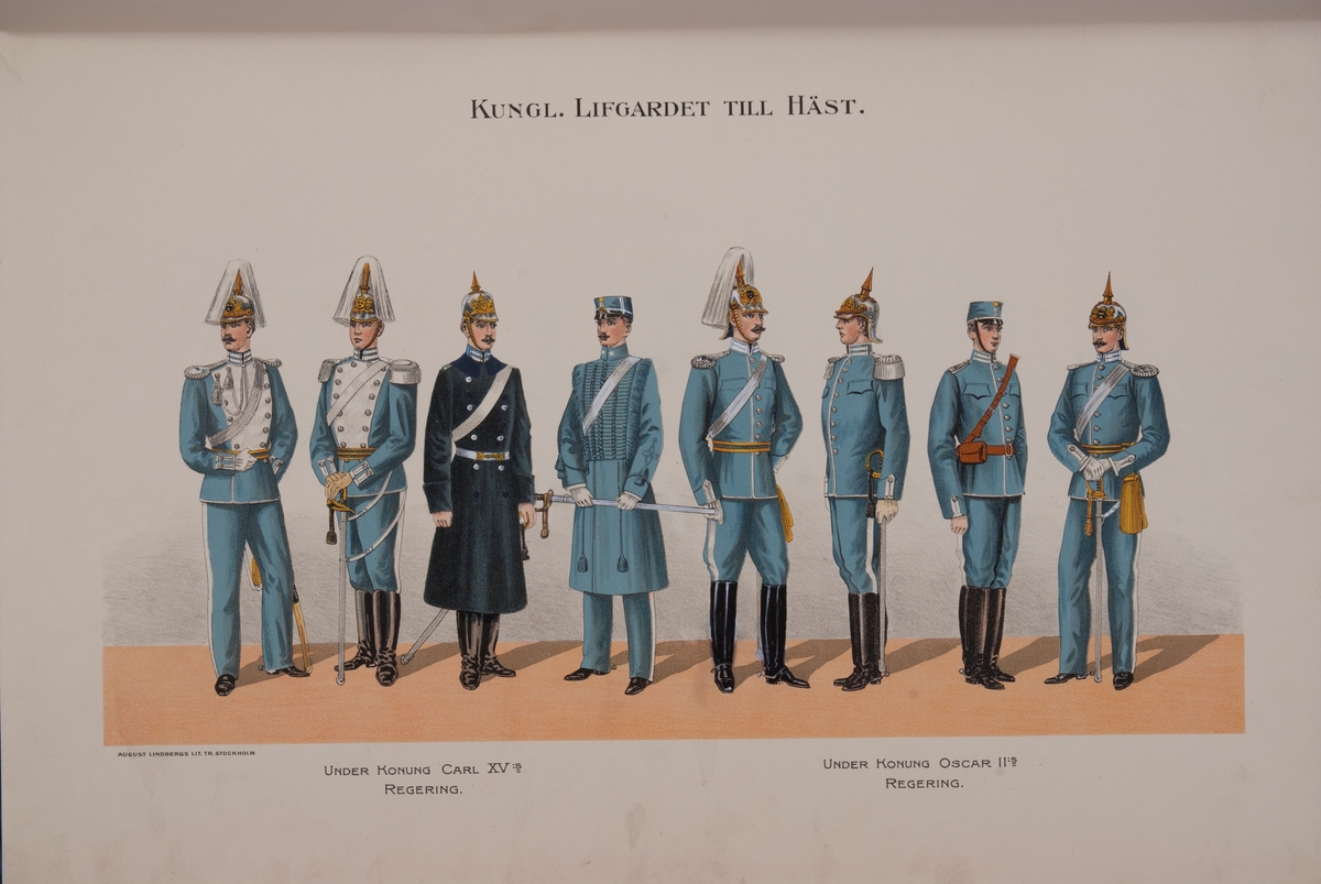 Plansch med uniform för Livgardet till häst under Karl XV regering och Oscar II regering. Ingår i boken Svenska krigsmakten under konungarna Carl XIV Johan, Oscar I, Karl XV, Oscar II, utgiven av P.B. Eklund.